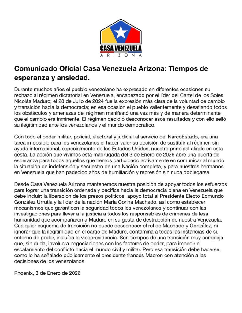 Comunicado Oficial Casa Venezuela Arizona: Tiempos de esperanza y ansiedad